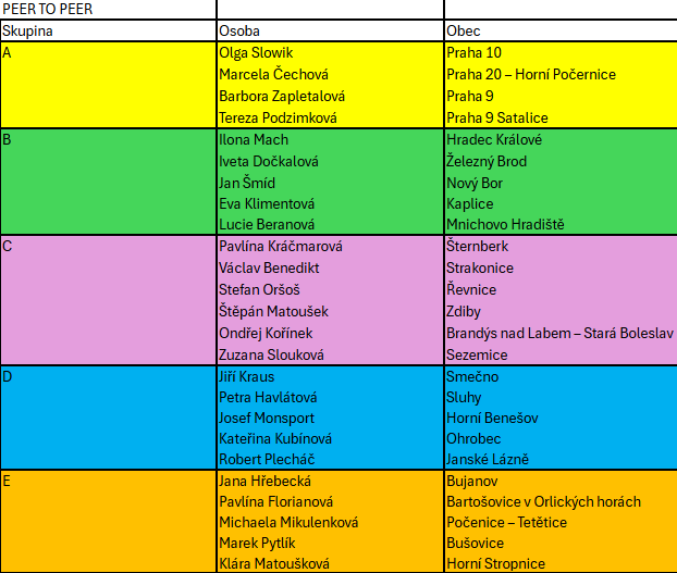 Peer to peer je forma vzájemné podpory mezi účastníky, kde si účastníci kurzu navzájem sdílejí zkušenosti a rady. Tento typ podpory umožňuje účastníkům učit se od sebe, poskytovat si zpětnou vazbu a pomáhat si v řešení problémů, což vede k lepšímu porozumění a rozvoji pro všechny zúčastněné.